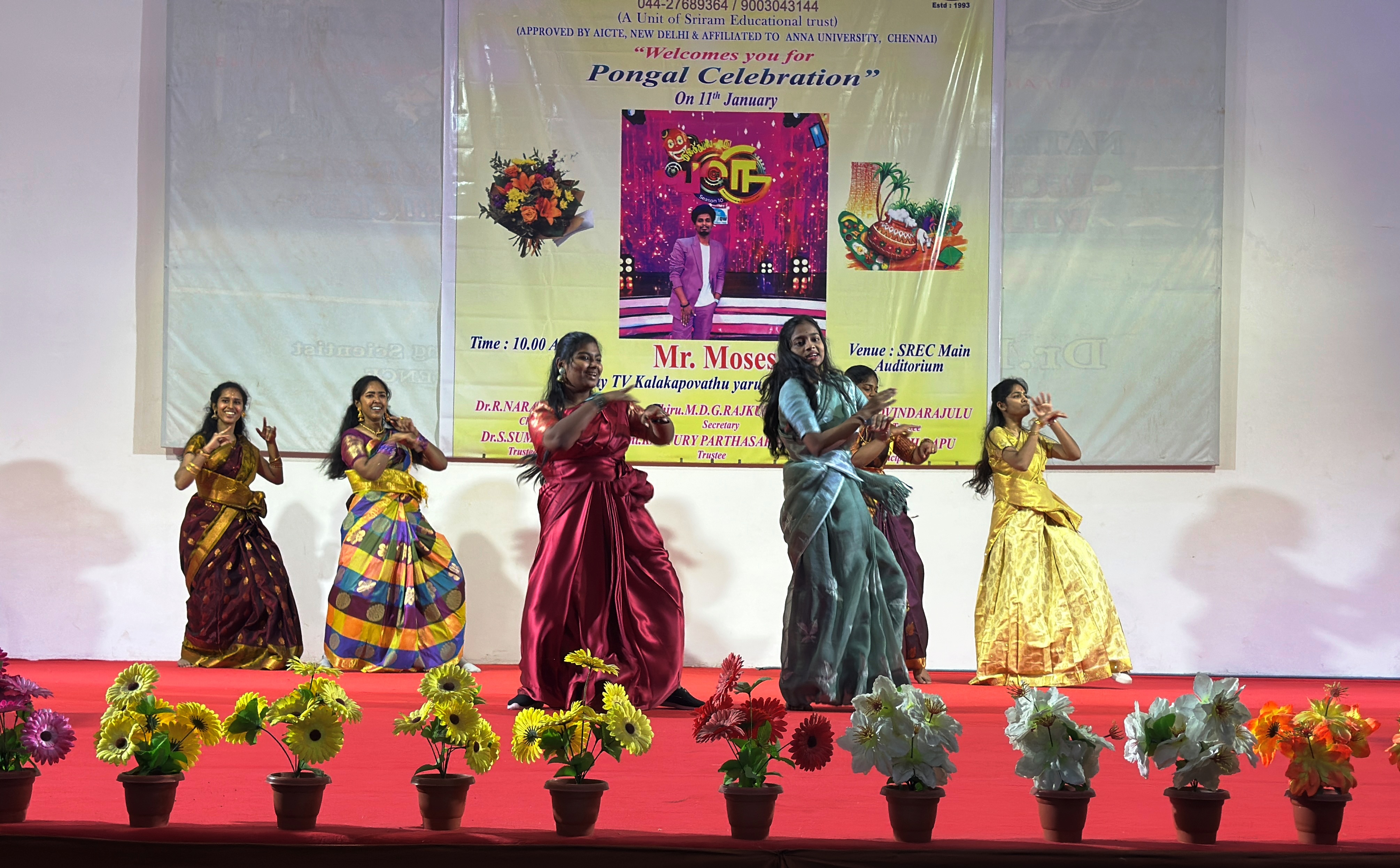 Sriram Engineering College celebrated a vibrant Pongal festival on January 11, 2025, with much enthusiasm. The event featured Special Guest Mr. Moses, a popular personality from Vijay TV's Kalakapovathu Yaru season 10. Students and faculty members came together to enjoy the festive spirit. The celebration included traditional activities like Uriyadi (a game where participants break a pot blindfolded), rope strike, and kolam (beautiful rangoli designs). The students displayed their energy and joy through a lively dance performance, further enhancing the festive mood. Everyone, including the chief guest, Mr. Moses, had a wonderful time, making it a memorable event for the entire college community.