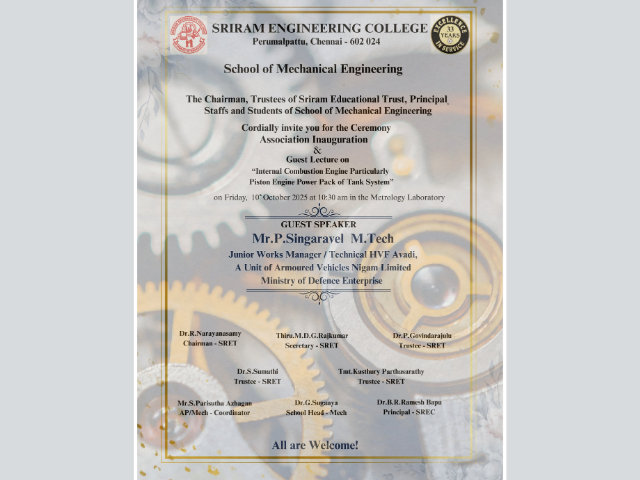 The School of Mechanical Engineering at Sriram Engineering College conducted its Association Inauguration and a Guest Lecture on 10th October 2025 at the Metrology Laboratory, marking the beginning of a new academic year of professional activities and technical enrichment.